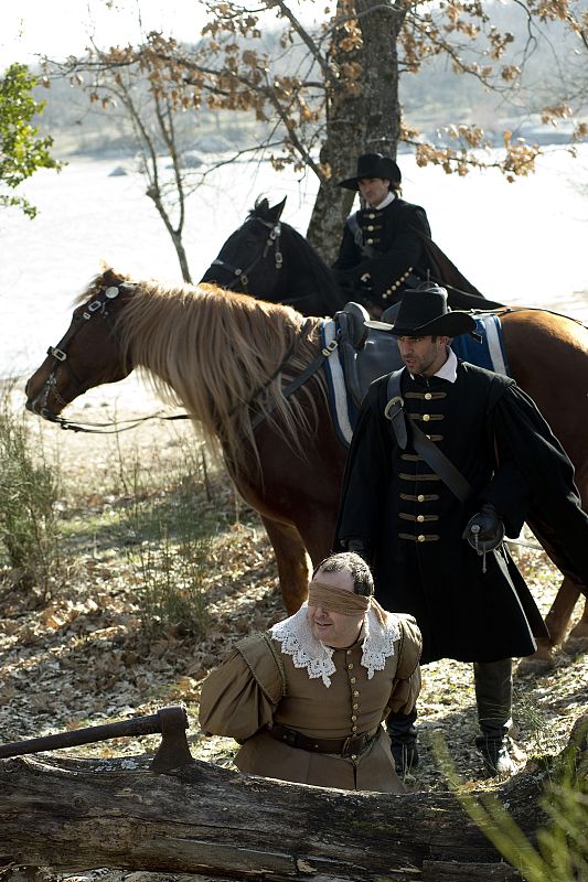 Se dispone a decapitarlo con un hacha... Pero aparecen los hombres del Comisario y... Águila Roja