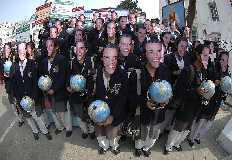 20.01.2009School children wearing masks of U.S. president-elect Barack Obama pose during a rally in Lucknow January 20, 2009. About 10,000 students took part in the rally on Tuesday to appeal to world leaders to curb terrorism, according to a media release. REUTERS/Pawan Kumar (INDIA)REUTERS/Pawan Kumar