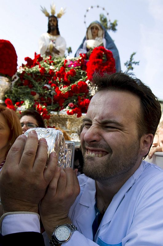 24.04.2011Las tallas del Cristo de Medinaceli de Ceuta (i) y de la Virgen de los Dolores Las tallas del Cristo de Medinaceli de Ceuta y de la Virgen de los Dolores son trasladadas por miembros de sus hermandades en el recorrido procesional que por las calles de la ciudad de Ceuta.EFE/Reduán -