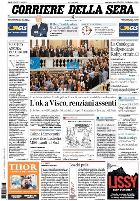 28.10.2017La imagen de los alcaldes independentistas en el Parlament protagoniza la portada del diario italianoCorriere della sera. El titular recoge la declaración de independencia y la respuesta de Rajoy.noticias