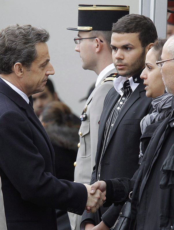 21.03.2012MON101. MONTAUBAN (FRANCIA), 21/03/2012.- El presidente francés Nicolas Sarkozy (izda) saluda a familiares de una de las víctimas, durante la ceremonia de homenaje a los tres militares asesinados por el francés de origen magrebí Mohamed Merah, sospechoso de haber matado en los últimos días a siete personas, en Montauban, Francia, el 21 de marzo del 2012. EFE/Jacques Brinon ***POOL*** PROHIBIDO SU USO PARA MAXPPPEFE/Jacques Brinon -