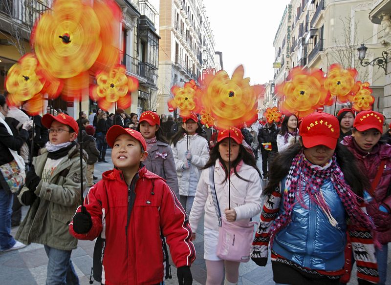 13.02.2010Niños chinos celebran la entrada del Año Nuevo, el año lunar del Tigre, con molinillos en sus manos, caminan por una calle de Madrid.noticias -
