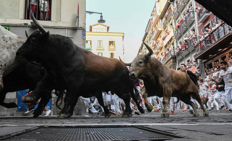 10.07.2018Los toros de la ganadería gaditana de Fuente Ymbro suben la cuesta de Santo Domingo hacia el Ayuntamiento junto a mansos y mozos durante el cuarto encierro de los Sanfermines 2018.EFE/JESUS DIGES