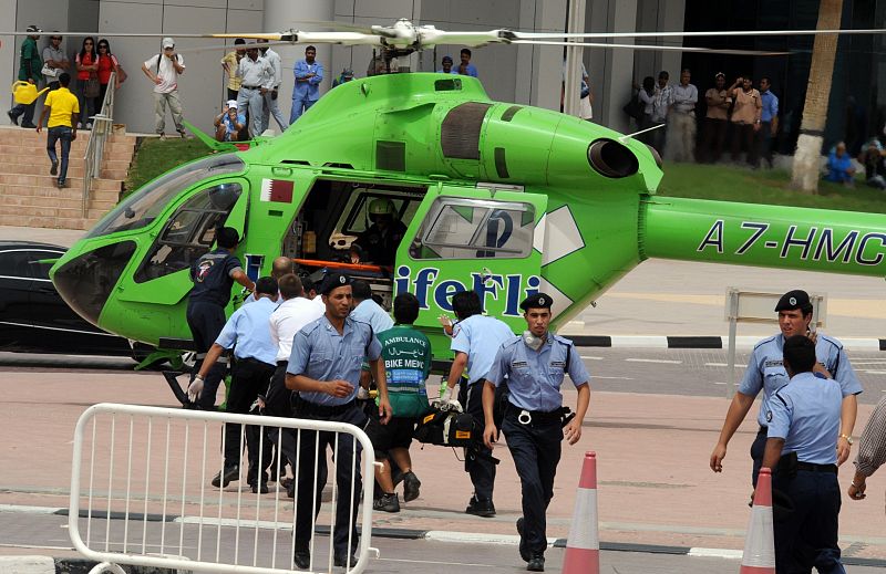28.05.2012A rescue helicopter waits to transport victims to hospital outside Doha's Villagio Mall after a fire broke out at the Gulf emirate's main shopping centre on May 28, 2012, killing at least 19 people, including 13 children, and two members of the civil defence. The fire started at a nursery, state minister for the interior Abdullah bin Nasser Al-Thani told reporters, adding that firefighters had to break through the roof to get to trapped children after a staircase to the first-floor nursery collapsed. AFP PHOTO/STRAFP PHOTO/STR -