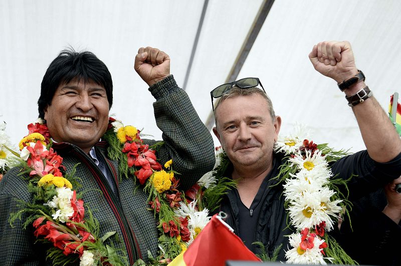 12.01.2014El presidente boliviano Evo Morales y Etienne Lavigne, director del Dakar, al finalizar la 7ª etapa del Dakar en Bolivia. Sólo la categoría de motos y quads tenía permitido el correr dentro del país.AFP PHOTO / FRANCK FIFE -