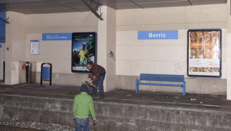 25.10.2008BI02. BERRIZ, Vizcaya, 24/10/08.- Unos operarios limpian de restos de cristales el andén de la estacion de Euskotren en la localidad vizcaina de Berriz, donde esta noche se han producido diversos daños materiales por una explosión. Las oficinas de la estación fueron las más dañadas por la explosión, en la que no se registraron heridos. EFE/LUIS TEJIDOEFE -