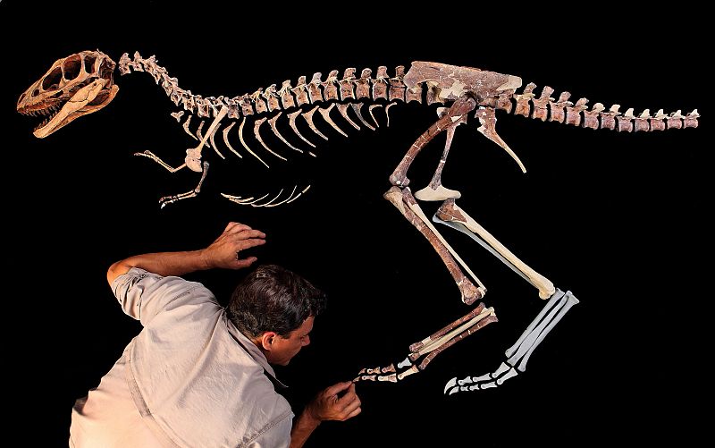 El co-autor del estudio, Paul Sereno de la Universidad de Chicago, junto al fósil. Este Tiranosaurio pesaba más o menos como una persona.