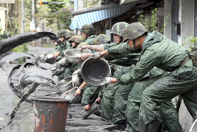 11.08.2009Los soldados limpian el barro dejado por el tifón Morakot tras su paso por condado de Nantou en el cenro de Taiwán.Reuters -