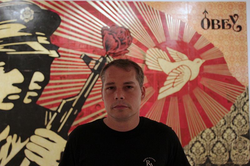 • Shepard Fairey 'Obey' ante una de sus obras en el CAC de Málaga.