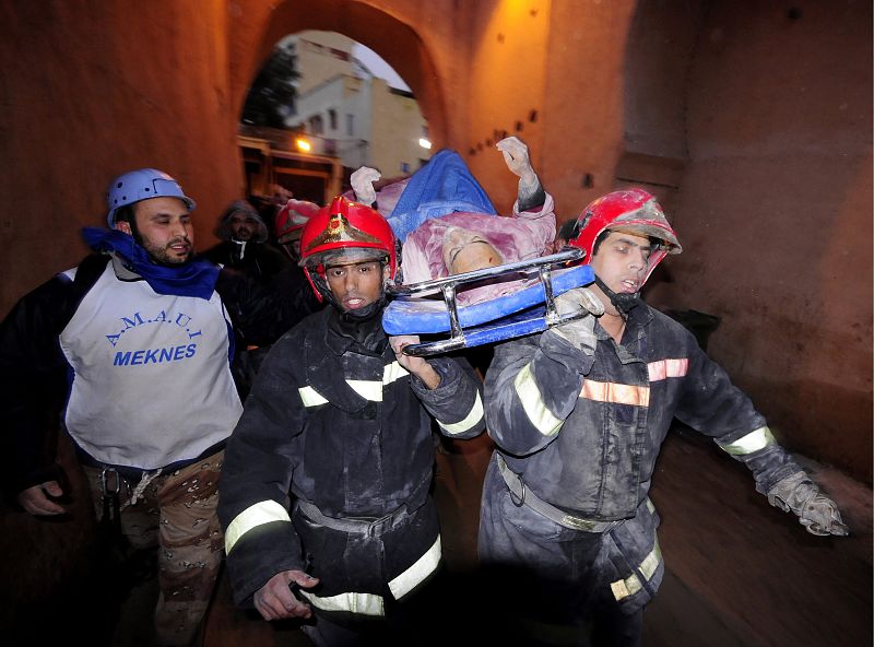 20.02.2010MEK12- MEQUÍNEZ (MARRUECOS), 19/02/2010.- Rescatistas cargan a una víctima hoy, viernes 19 de febrero de 2010, al derrumbarse el minarete de la mezquita de Bab el Bardiyine, en la medina de Mequínez, en el centro de Marruecos, donde al menos 36 personas murieron y otras 71 han resultado heridas, ocho de ellas graves. EFE/KARIM SELMAOUIEFE/KARIM SELMAOUI