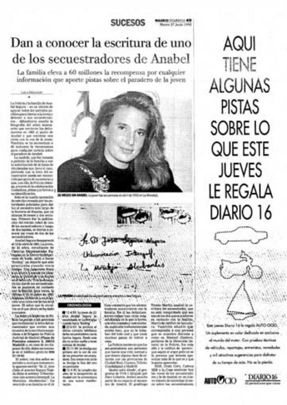 22.02.2010El 27 de junio de 1995 el Diario 16 difunde la decisión de la familia de aumentar la recompensa a 60 millones de pesetas a aquel que aporte información sobre el paradero de Anabel. Hacen pública también la letra de uno de los secuestradores.tve
