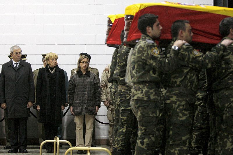 11.11.2008STG05. SANTIAGO DE COMPOSTELA, 11/11/08.- La ministra de Defensa, Carme Chacón (d), consuela a los familiares de Rubén Alonso Ríos y Juan Andrés Suárez García en el aeropuerto compostelano de Lavacolla, a donde han llegado esta noche los féretros con los restos mortales de los dos militares españoles fallecidos ayer en un ataque suicida en Afganistán.EFE/Lavandeira jr -