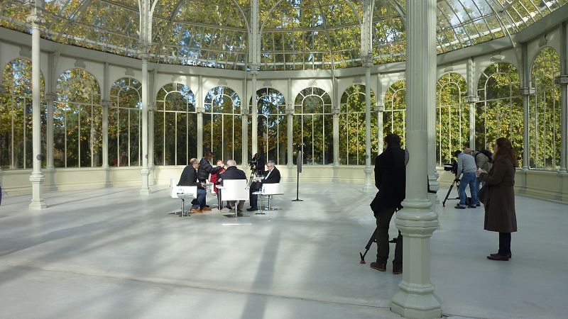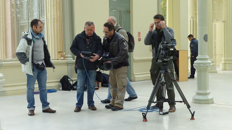 El equipo técnico visionando las primeras grabaciones en el Palacio de Cristal