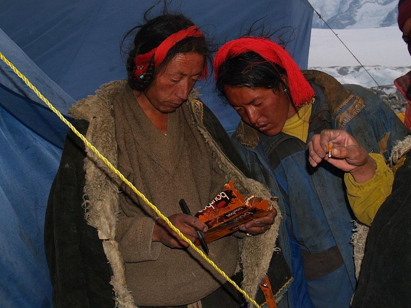 29.04.2009Dos sherpas pintan en un envoltorio de comida parte del recorrido a seguir.tve