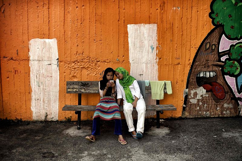 02.07.2016Dos niñas miran un telénono sentadas en el banco de un colegio abandonado, que los voluntarios han convertido en un lugar habitable para los refugiados sirios y afganos.am