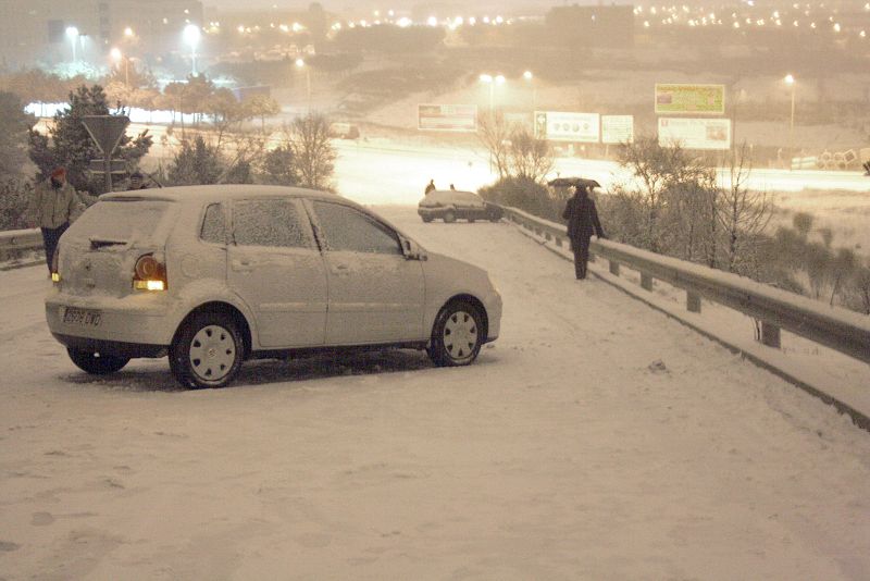 MD91. MADRID 10/01/2010.- Dos vehículos permanecen inmovilizados en una de las salidas de la M-40, a la altura del polígono de Las Mercedes de Madrid, cubierta de nieve después de las fuertes nevadas que se han registrado durante toda la tarde en la capital. La Comunidad de Madrid ha activado a las doce y media de esta mañana el nivel 1 del Plan de Inclemencias Invernales y en ese mismo momento se ha creado "un gabinete de crisis" para coordinar todos los medios frente a la nevada. EFE/Chema Angullo