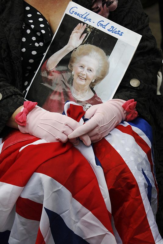 Una espectadora sostiene una foto de Margaret Thatcher a la espera de que pase el cortejo fúnebre