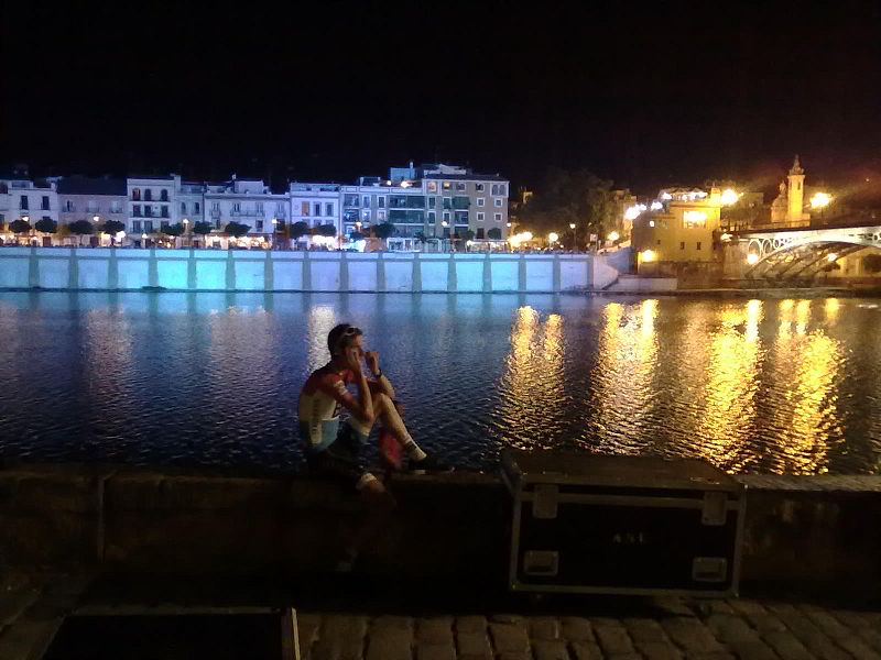 Frank Schleck alivia el calor sentado a la orilla del río Guadalquivir antes de la presentación