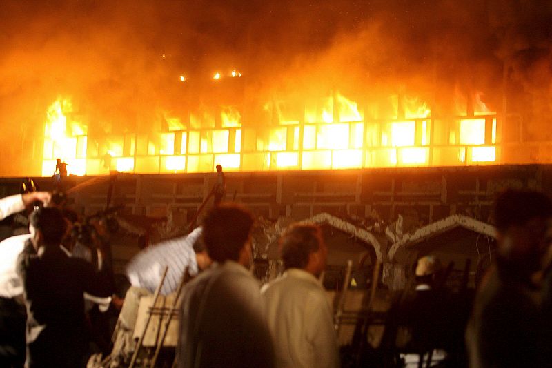 20.09.2008El atentado contra el Marriott ha provocado un espectacular incendio en el hotel de 290 habitaciones. (Islamabad, 20/09/08).EFE/ OLIVIER MATTHYS