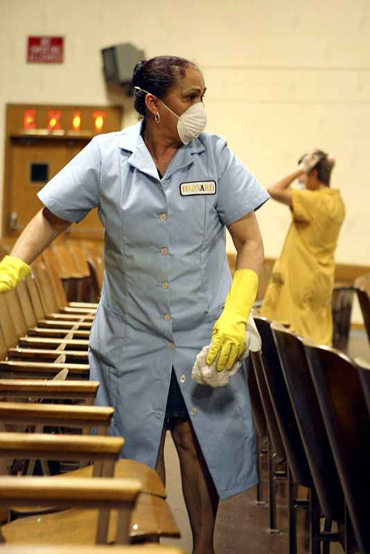 27.04.2009QUE005- NUEVA YORK (EEUU), 26/04/09.- Una mujer limpia el auditorio de la escuela preparatoria St Francis en el barrio de Queens, en Nueva York (EEUU), hoy 26 de abril de 2009. El alcalde de Nueva York, Michael Bloomberg, llamó a la calma ante la alarma despertada por la confirmación de que ocho estudiantes de la ciudad sufren gripe porcina y apuntó que, por el momento, no se observa una rápida propagación del virus entre la población. EFE//DANIEL BARRYEFE//DANIEL BARRY