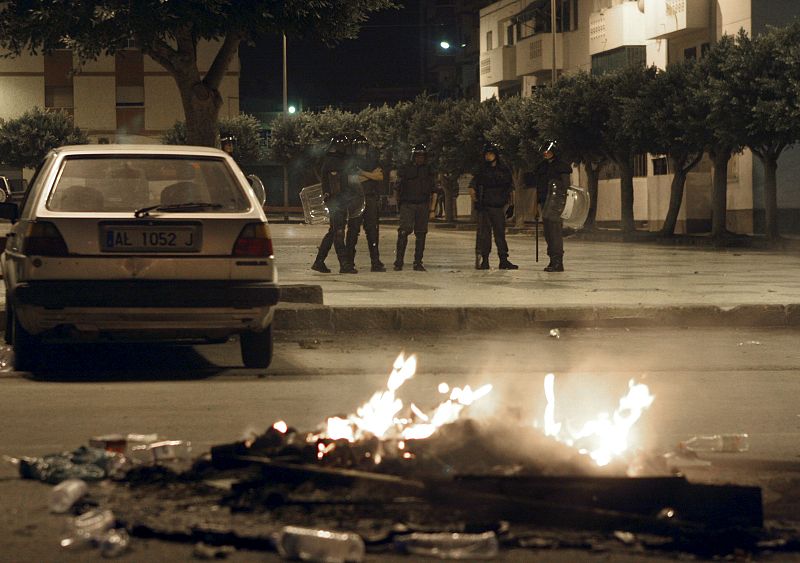 AL04. Roquetas de Mar (Almería), 07/09/08. Un grupo de antidisturbios custodia las calles donde se han producido los disturbios en Roquetas de Mar tras la muerte a puñaladas hace 24 horas de un senegalés de 28 años, que se iniciaron cuando un grupo de subsaharianos ha tratado de apedrear una ambulancia. EFE/Ricardo García