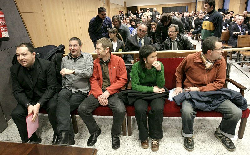 BIL14. BILBAO, 08/01/09.- Los cinco representantes de la izquierda abertzale Pernando Barrena, Arnaldo Otegi, Rufino Etxeberria, Olatz Dañobeitia y Juan José Petrikorena (izda-dcha), al inicio del juicio que se sigue contra ellos, el lehendakari, Juan José Ibarretxe, y los dirigentes del PSE-EE Patxi López y Rodolfo Ares por las reuniones que mantuvieron durante el alto el fuego de ETA. EFE/Alfredo Aldai ***POOL***
