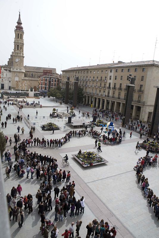 Cientos de personas hacen "cola" en la Plaza del Pilar de Zaragoza ante un inodoro hinchable gigante para llamar la atención de los mandatarios mundiales sobre el derecho universal al acceso al agua potable y al saneamiento digno y de calidad