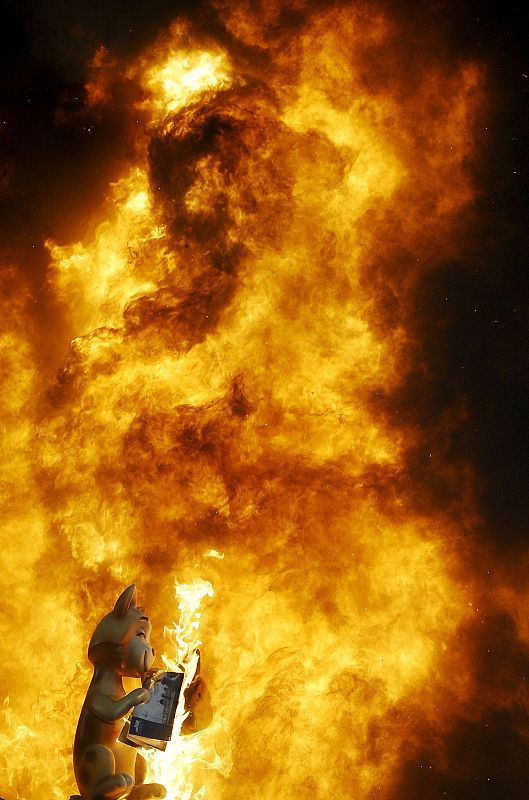 20.03.2010V59. VALENCIA, 19/03/2010.- Un ninot de la falla del Ayuntamiento de Valencia, aguanta bajo las llamas de la cremá que ponen fin a la fiesta fallera. EFE /Kai Försterling.EFE /Kai Försterling -