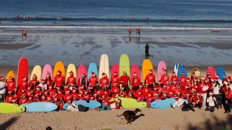 24.12.2017Casi un centenar de surfistas vestidos de Papá Noel desafiando el frío de las aguas gallegas en la playa de Patos, en el municipio pontevedrés de Nigrán.Salvador Sas