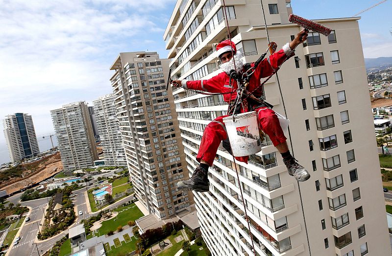 24.12.2018Un trabajador saludando mientras limpia las ventanas de un edificio, disfrazado de Papá Noel, en Concón, Chile.