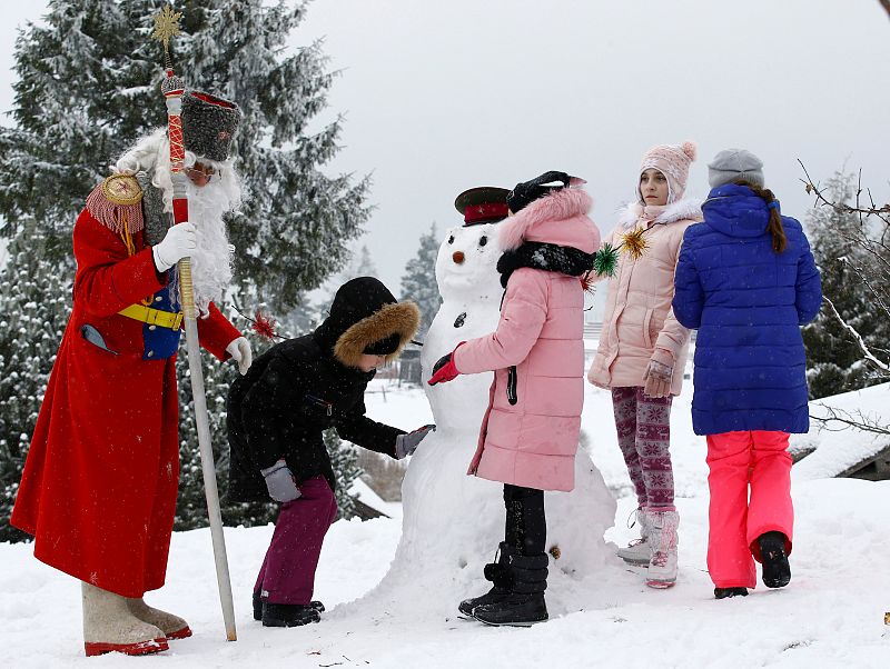 24.12.2018Un hombre vestido como el padre Frost, el equivalente a Papá Noel, jugandocon los niños en el memorial "Stalin Line" cerca del pueblo de Goroshki, Bielorrusia.