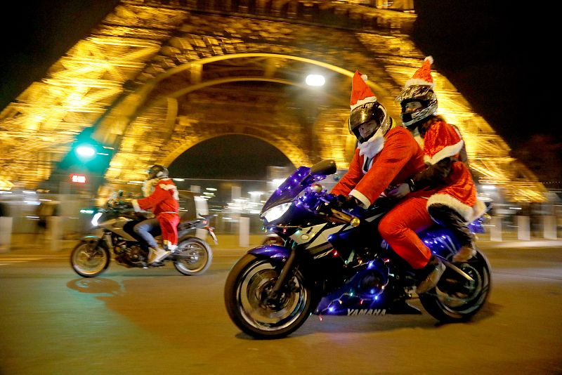 24.12.2018Personas vestidas con trajes de Papá Noel pasando en moto cerca de la Torre Eiffel en París, Francia. -