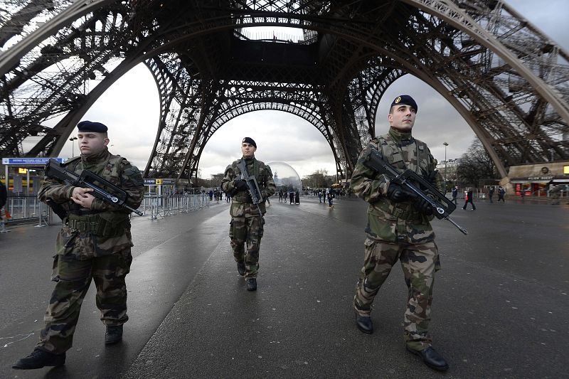 08.01.2015French soldiers patrol in front of the Eiffel Tower on January 8, 2015 in Paris as the capital was placed under the highest alert status a day after heavily armed gunmen shouting Islamist slogans stormed French satirical newspaper Charlie Hebdo and shot dead at least 12 people in the deadliest attack in France in four decades. A huge manhunt for two brothers suspected of massacring 12 people in an Islamist attack at a satirical French weekly zeroed in on a northern town Thursday after the discovery of one of the getaway cars. As thousands of police tightened their net, the country marked a rare national day of mourning for Wednesday's bloodbath at Charlie Hebdo magazine in Paris, the worst terrorist attack in France for half a century. AFP PHOTO / BERTRAND GUAYAFP PHOTO / BERTRAND GUAY