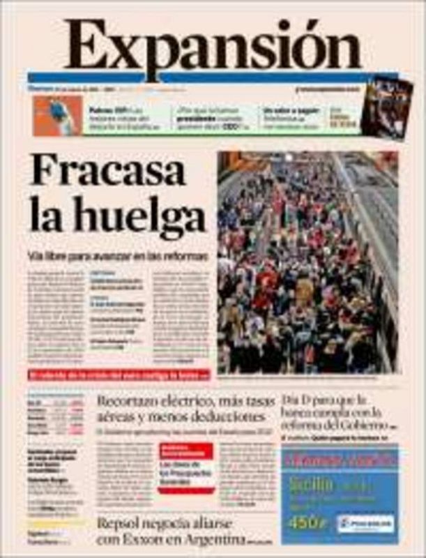 30.03.2012El diario económico Expansión titula en su portada impresa, "Fracasa la huelga" y dedica la foto a una marcha sindical en las calles de Madrid.RTVE.ES / EXPANSIÓN