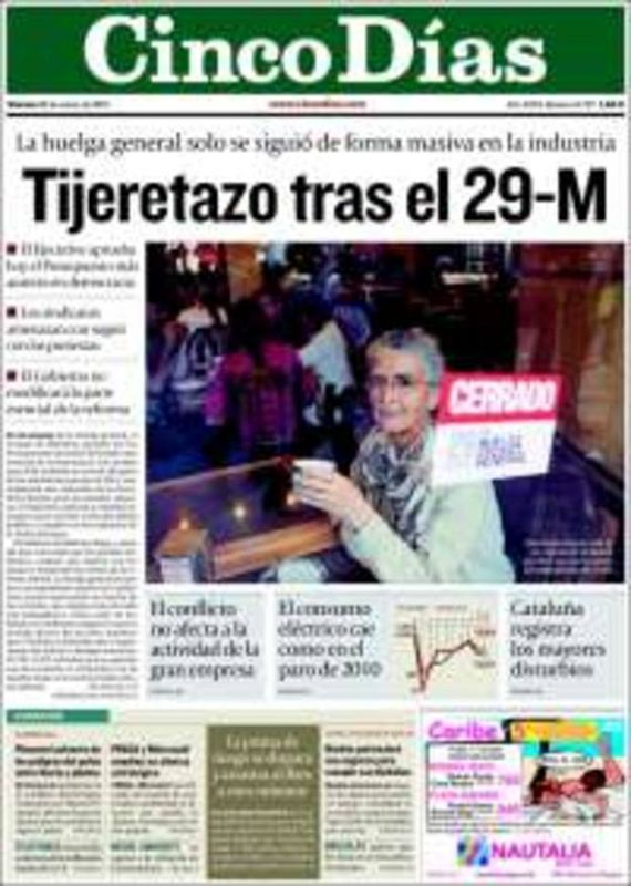 30.03.2012El periódico económico Cinco Días abre su portada con "Tijeretazo tras el 29M" en referencia a los Presupuestos Generales del Estado que anunciará hoy el Gobierno, tras la huelga general del jueves. La foto de portada es para una mujer mayor y un cartel de 'cerrado'RTVE.ES / CINCO DÍAS -