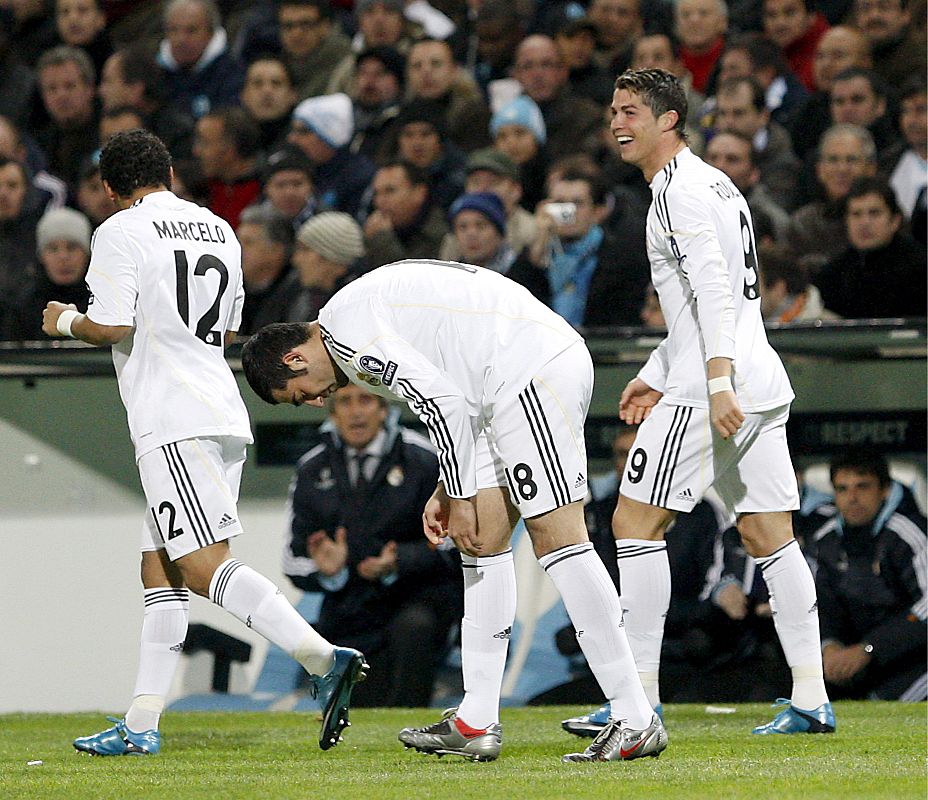 08.12.2009Cristiano Ronaldo es felicitado por sus compañeros Marcelo y Albiol después de marcar el gol inaugural del partido.EFE