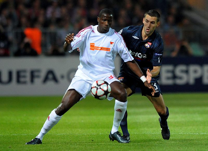 29.09.2009Adamo Coulibaly del Debrecen VSC lucna por el control del balón con Anthony Reveillera del Olympique de Lyon.EFE