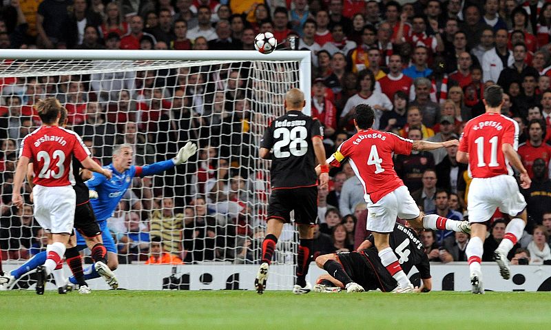 29.09.2009Cesc Fábregas realiza un lanzamiento contra la portería de Antonis Nikopolidis, del Olympiacos.EFE -
