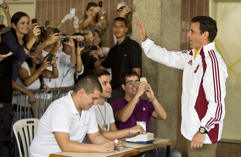 14.04.2013Venezuelan opposition presidential candidate Henrique Capriles waves after voting in Caracas, on April 14, 2013. Venezuelans flocked to the polls Sunday to vote for Hugo Chavez's successor, choosing between the handpicked heir of his socialist revolution and an opponent vowing change in the divided nation. AFP PHOTO/RONALDO SCHEMIDTAFP PHOTO/RONALDO SCHEMIDT