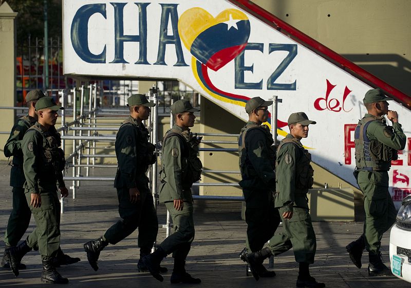 Venezuelan army soldiers guard a polling station in Caracas on April 14, 2013. Venezuelans headed to the polls Sunday to elect Hugo Chavez's successor, with his political heir, Nicolas Maduro, hoping to continue his socialist revolution and rival Henrique Capriles vowing change. AFP PHOTO/Raul ARBOLEDA