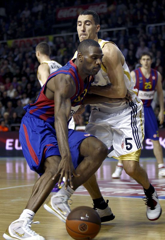 23.03.2010Gianluca Basile del Regal FC Barcelona, intenta frenar el avance del base lituano Rimantas Kaukenas, del Real Madrid.EFE -