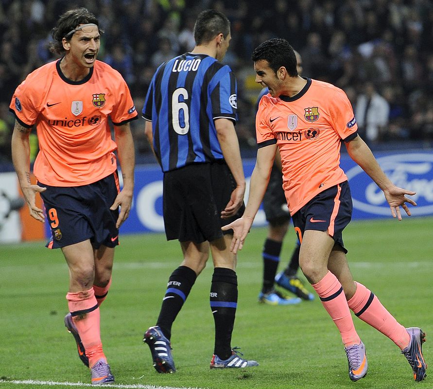 El delantero español del FC Barcelona, Pedro celebra tras anotar el primer gol para su equipo delante de Javier Zanetti del Inter de Milán.