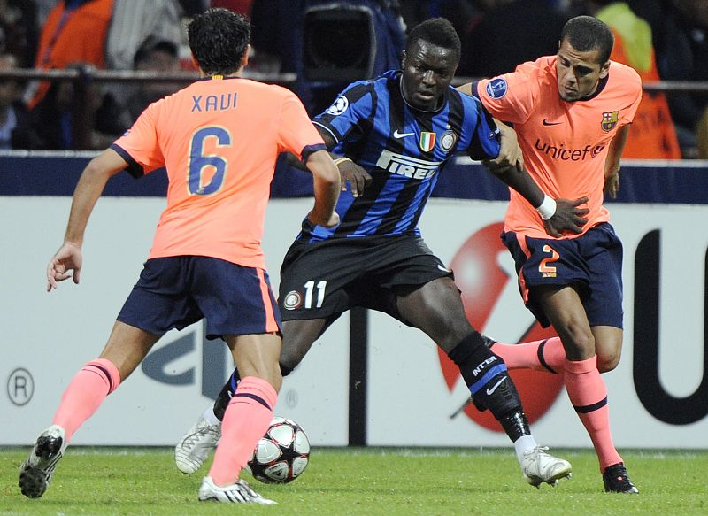 16.09.2009Xavi Hernández y Daniel Alves disputan el balón con Sulley Muntari.EFE