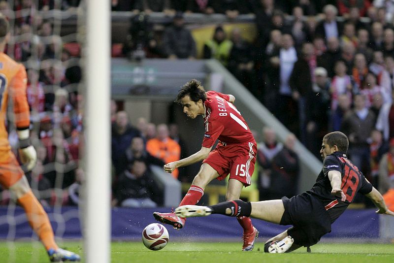 30.04.2010LIV01.LIVERPOOL (REINO UNIDO).29/4/2010.- El centrocampista israelí del Liverpool, Yossi Benayoun (c), lanza a puerta para intentar batir al portero del Atlético de Madrid, De Gea (i), en presencia del defensa Álvaro Domínguez (d), durante el partido de vuelta de la semifinal de la Liga Europa que se juega en el estadio de Anfield en Liverpool, hoy jueves 29 de abril de 2010. EFE/ LEE SANDERS ***PROHIBIDO SU USO EN INTERNET SIN LICENCIA DE FOOTBALL DATA CO. LTD****EFE/ LEE SANDERS
