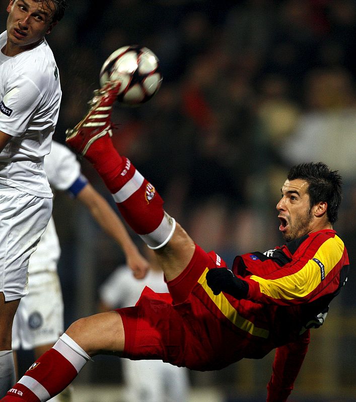Alvaro Negredo se disputa el balón con Ersin Mehmedovic del Unirea Urziceni.
