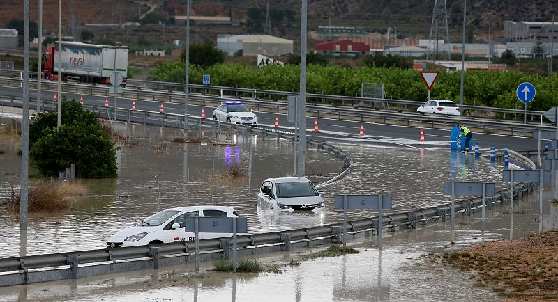 Imagen de una de las entradas a la población Alicantina de Orihuela, cortada por la inundaciones producidas por el paso de la Gota Fría que afecta a la Comunidad Valenciana.