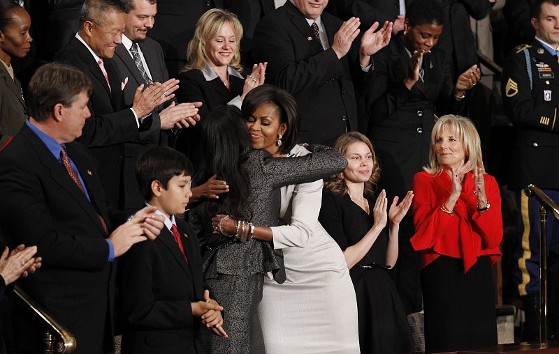 26.01.2011U.S. first lady Michelle Obama is embraced as she arrives at her box for U.S. President Barack Obama's State of the Union address to a joint session of Congress, on Capitol Hill in Washington, January 25, 2011. At far right is Jill Biden, wife of Vice President Joe Biden. REUTERS/Jim Young (UNITED STATES - Tags: POLITICS)REUTERS/Jim Young