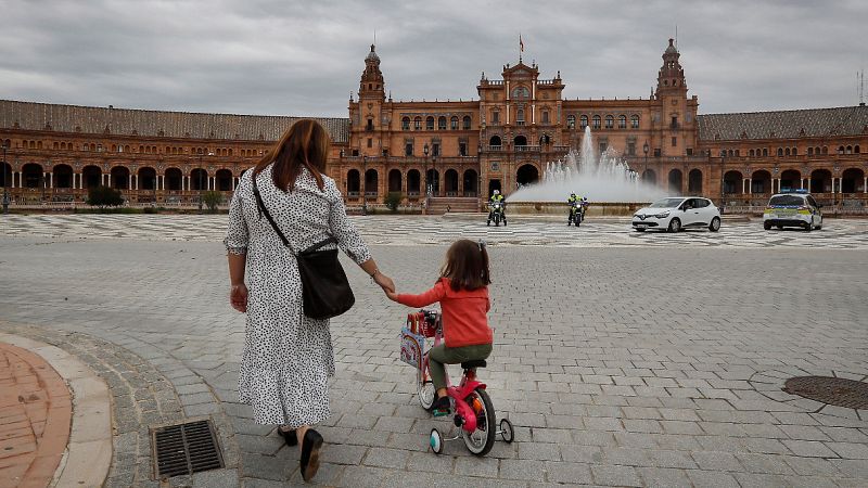 26.04.2020Los niños pueden pasear desde las 9 de la mañana hasta las 21 horas, salvando así el confinamiento decretado por el estado de alerta por la pandemia de Covid-19. En la imagen, una madre y una hija en Santa Cruz de Tenerife. -