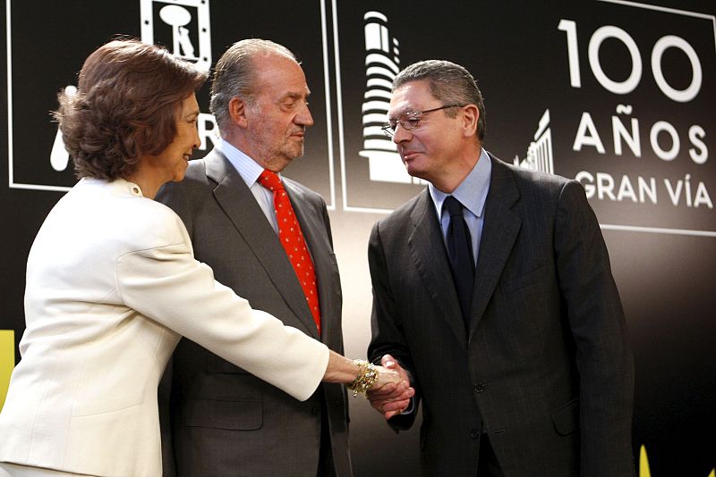 05.04.2010MD35. MADRID, 05/04/2010.- El alcalde de Madrid, Alberto Ruiz-Gallardón, saluda a la reina Sofía, en presencia de Juan Carlos I, durante el acto institucional de la celebración del centenario de la Gran Vía, en la sede del Área de Economía del Ayuntamiento. EFE/Chema MoyaEFE/Chema Moya