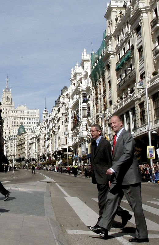 05.04.2010MD18. MADRID, 05/04/2010.- El Rey y el alcalde de Madrid, Alberto Ruiz-Gallardón, caminan juntos durante uno de los actos de celebración con los que se va a conmemorar el centenario de la Gran Vía madrileña, en el que inagurarán un monolito recordatorio y visitarán una exposición de fotografías de las dos primeras décadas del siglo XX. EFE/JuanJo MartinEFE/Juanjo Martin